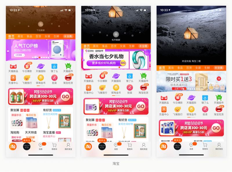 互动式引导是一种较为隐蔽的引导,通常在用户使用产品的某些特定过程中才会触发。其形式一般为简洁的文案或图形说明,如下拉刷新、手势互动等,用以引导用户完成当前操作。比如淘宝在下拉过程中,随着下拉幅度的不同而对应两个不同的操作,小幅度是刷新,大幅度则进入淘宝二楼,其引导在下拉的时候出现并变化,帮助用户选择要进行的操作。