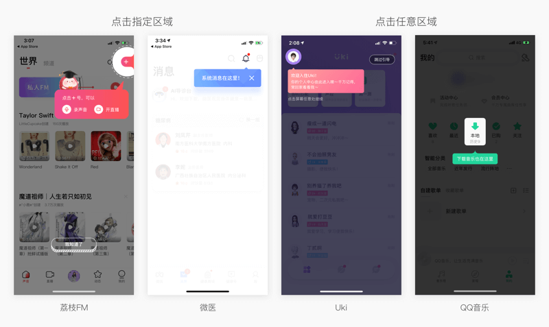 气泡引导又称浮层式引导,常用于新功能上线、核心功能说明或是介绍隐藏操作等。形式一般为半透明的气泡浮层,配文字说明、图标、按钮等,出现于功能旁边。由于没有蒙层它对页面其他内容影响较小,但出现位置和气泡的箭头又让它带有很强的指向性,是对用户干扰较小,又能成功吸引其注意的引导。