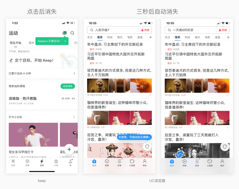 气泡可以分为模态和非模态两种,模态通常带按钮,或是需要点击相关功能后才消失,而非模态则是3-5秒后自动消失,具体可以根据引导的重要程度而定。