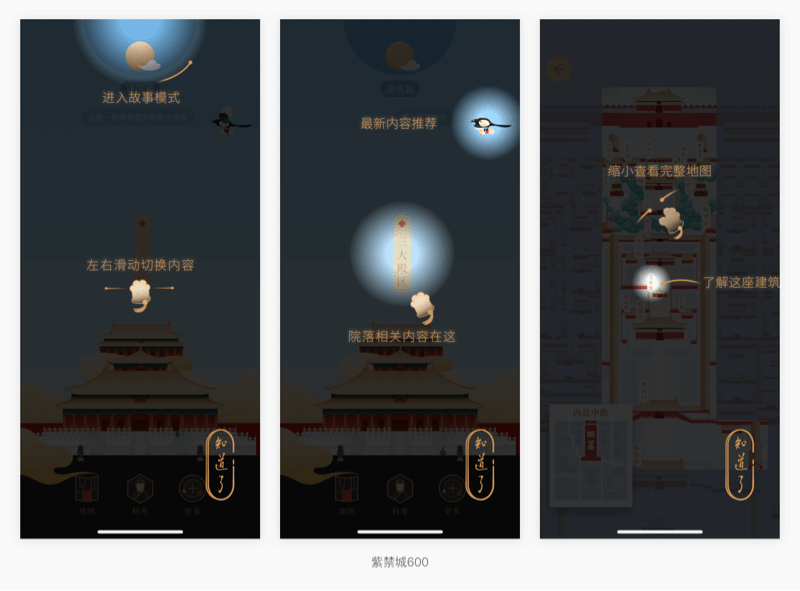 比如紫禁城600中的引导,手势说明没有使用惯用的人手的形象而是采用了猫爪的形象,与紫禁城中的御猫联系起来,“知道了”按钮模仿古代印章的形式,这些都是与产品主题风格相关的元素,从视觉上突出了品牌的特色,成为独特的记忆点。