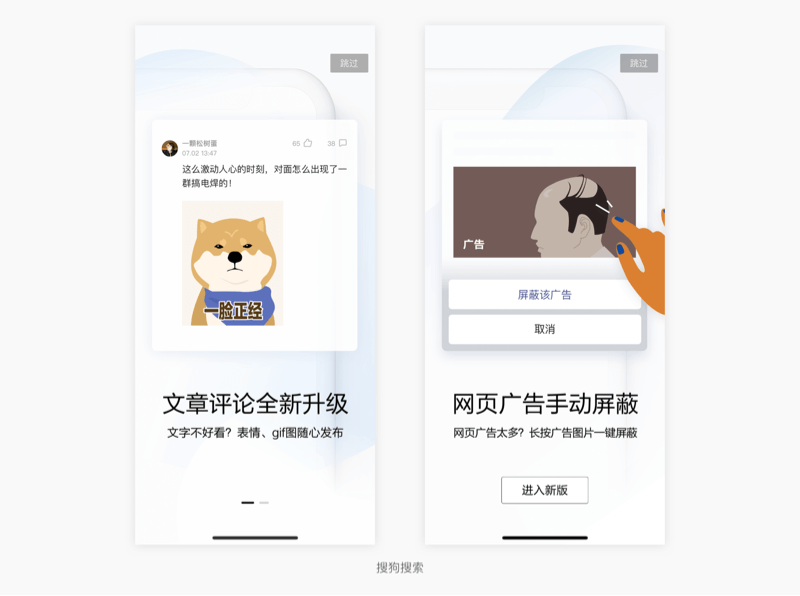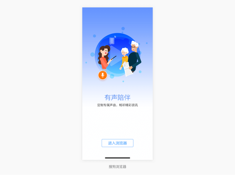 比如搜狗浏览器的引导页只有一页,无论从文案、插图的内容都围绕着该版本中的主要功能——有声朗读,排除不必要的干扰突出重点,让用户更容易记住。