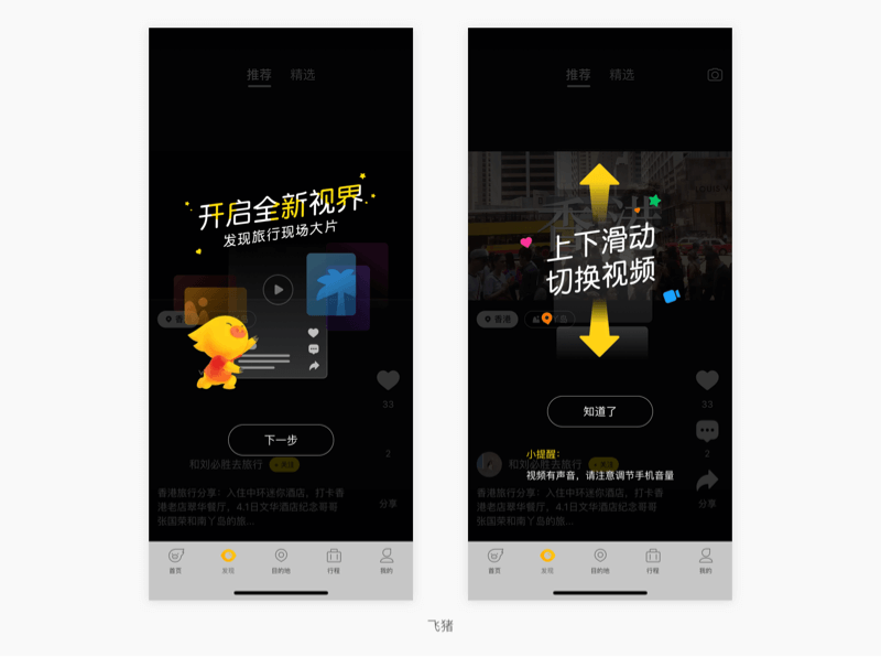 飞猪的引导则贴心的提醒用户注意音量,为用户避免声音而带来的尴尬情况,从细节处体现了产品的用心与关怀。