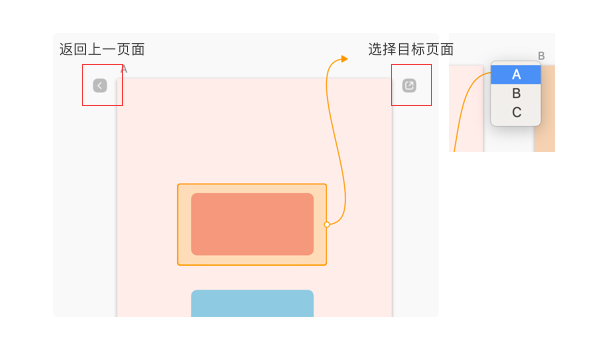 点击Hotspot或者使用快捷键“H”呼出热区功能,在要建立热区的位置拉取适合大小的框,然后为热区建立链接。建立链接时,页面顶部左右两侧各有一个小图标,分别可以返回上一页面和直接选择目标页面。
