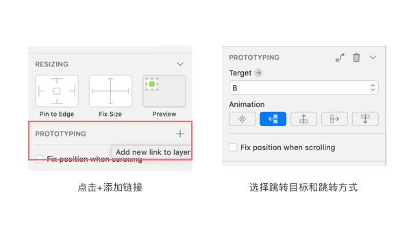 选中色块,点击Link或者在右侧Prototyping点添加,当色块上出现跳转的连接线时,再点击要跳转的界面就可以了。